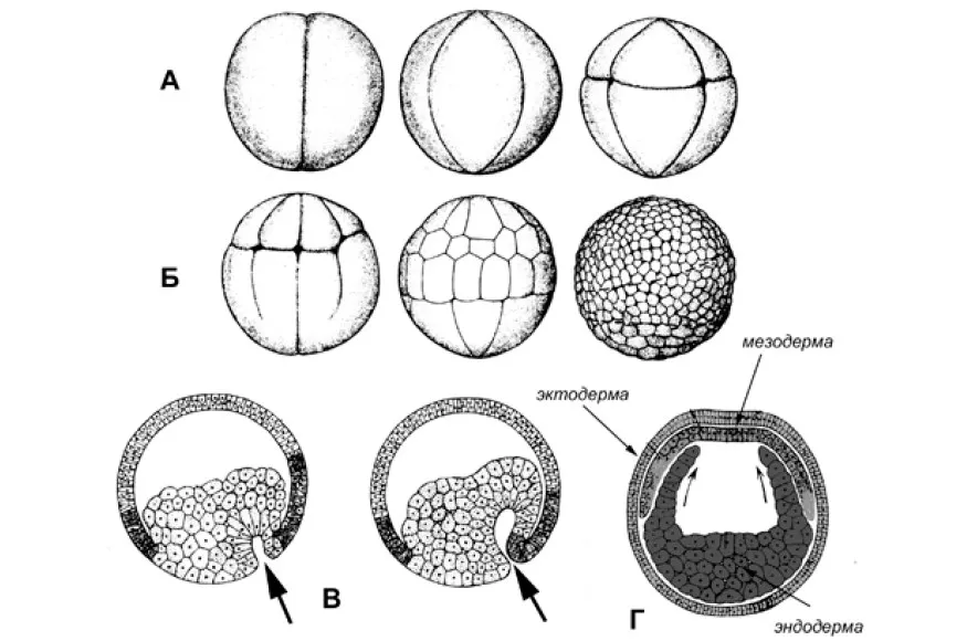 Есть нюансы этого процесса для разных групп живых существ, но для большинства дробление завершается примерно одинаково. Сначала формируется морула, в которой бластомеры сидят, плотно прижавшись друг к другу. Следующий этап — бластула. Внутри шаровидного сгустка появляется заполненное жидкостью пространство (бластоцель), поскольку клетки начинают отдаляться друг от друга. Потом образуется гаструла, в которой уже два или три клеточных слоя (один остается снаружи, остальные располагаются внутри; бластоцель сохраняется). Гаструла может образовываться путем «впячивания» внутрь клеток наружного слоя бластулы (этот процесс называется инвагинацией).