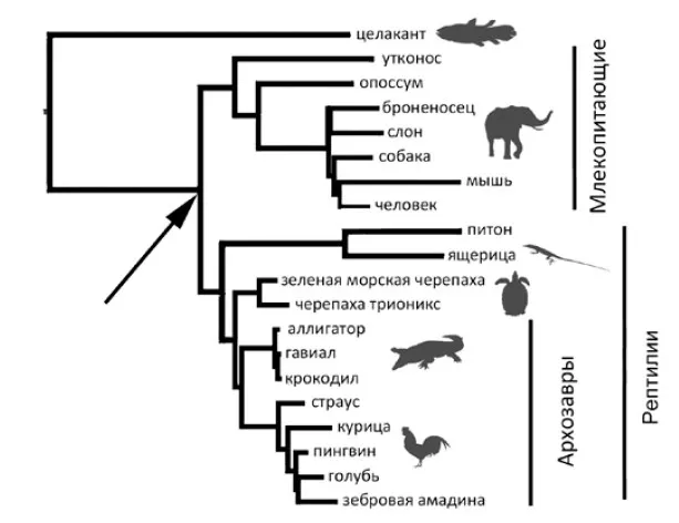 Фрагмент современного родословного древа высших позвоночных. Стрелкой показана точка, в которой разошлись эволюционные пути млекопитающих и рептилий (включая птиц)