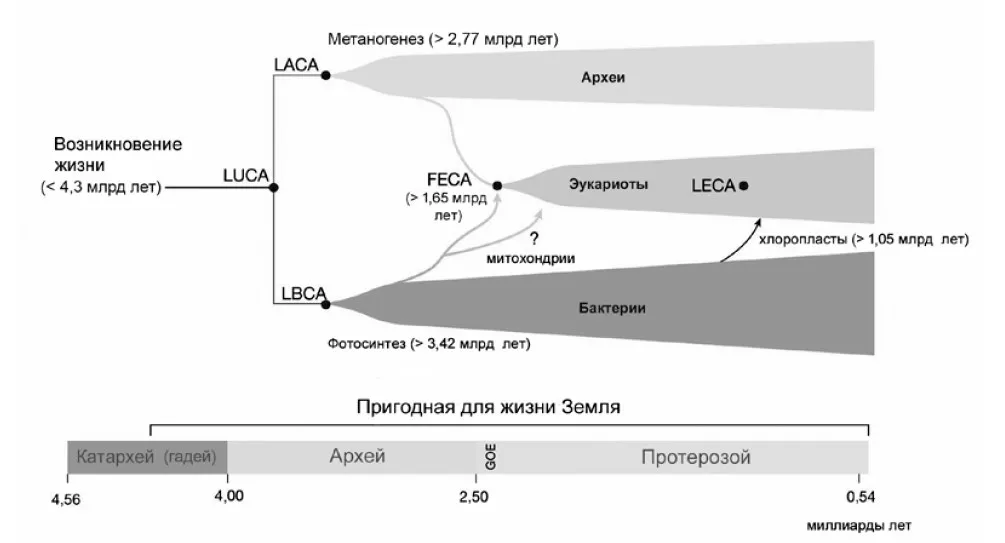 От LUCA произошли три основных подразделения (домена) жизни: бактерии (давшие начало фотосинтезу), архебактерии или археи (освоившие метаногенез) и эукариоты (все живые существа с ядром и хромосомным аппаратом в клетках, в том числе люди).
