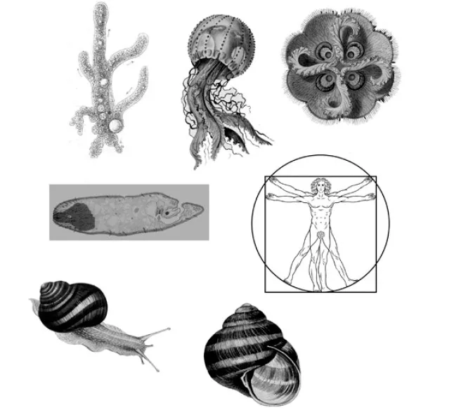Другое различение — по типу симметрии. Живые существа могут быть вовсе лишены симметрии (бесформенные амебы, те же трихоплаксы и т. п.). Их полная противоположность — морские ежи, через которых можно провести множество осей и плоскостей симметрии, откуда ни начни. Но, как и амебы, в морфологическом отношении морские ежи считаются примитивными. Радиальная симметрия — это когда вдоль оси пересекаются несколько плоскостей (скажем, как у медузы аурелии). Билатеральная (двусторонняя симметрия) — единая ось, зеркально разделяющая тело на правую и левую стороны. Все это идеальные типы симметрии. Реальные же организмы могут отклоняться от того или иного типа соразмерности. Например, человеческая ладонь асимметрична: левая и правая ее стороны — не зеркальное подобие друг друга. Двусторонняя симметрия внешнего строения человеческого тела перестает блюстись внутри нас — есть парные органы (легкие, почки, полушария мозга), есть непарные (сердце, печень).