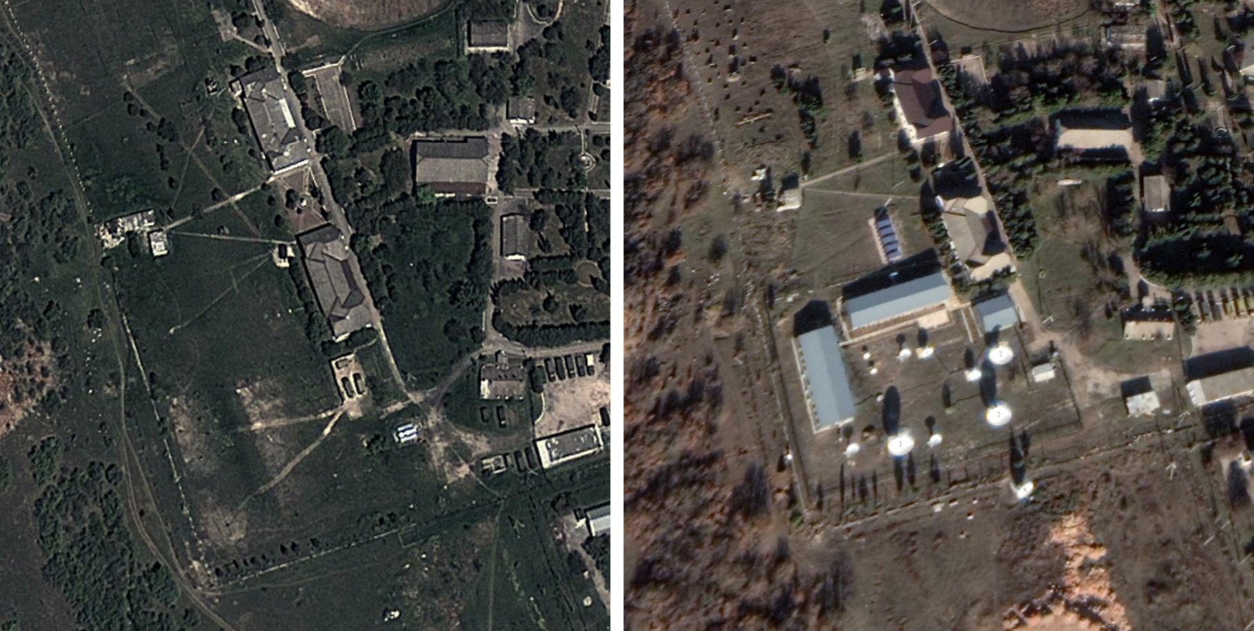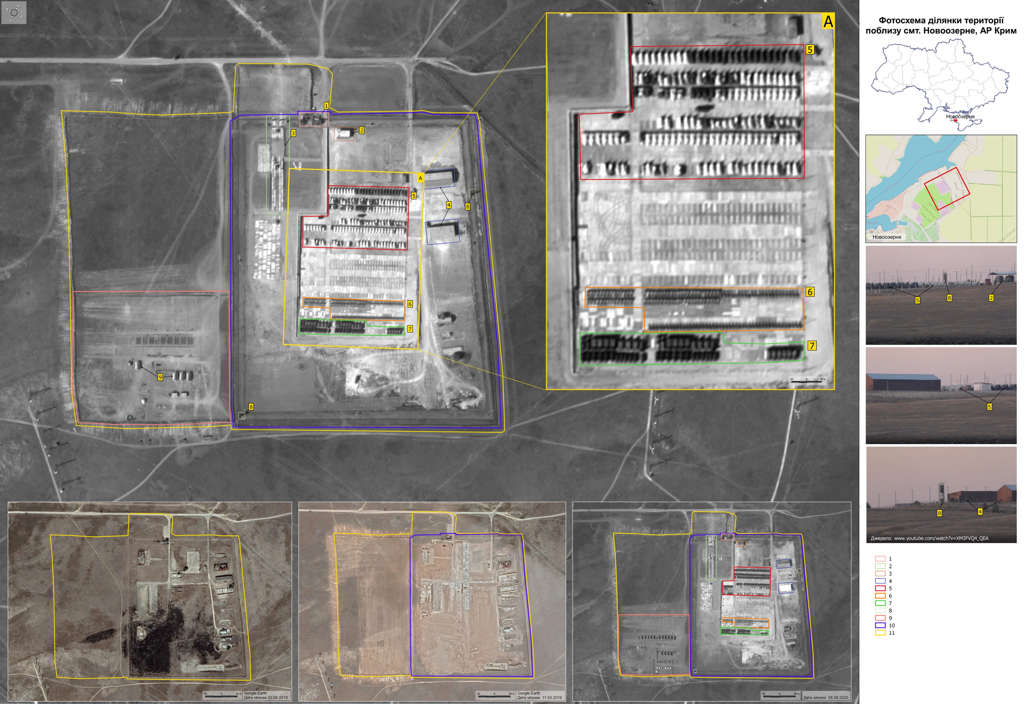 Так, на одном из самых свежих снимков зафиксирован поселок Новоозерное, неподалеку от озера Донузлав. В конце 2020 года здесь, фактически посреди степи, появилась военная база. По словам начальника информационно-аналитического центра Национального космического центра Украины Сергея Янчевского, еще в 2018 году на этом месте были развалившиеся коровники.