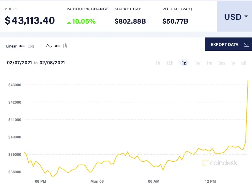 Стоимость биткоина обновила исторический максимум, на 16:07 мск его стоимость достигла 43 113 долларов, свидетельствуют данные Coindesk.