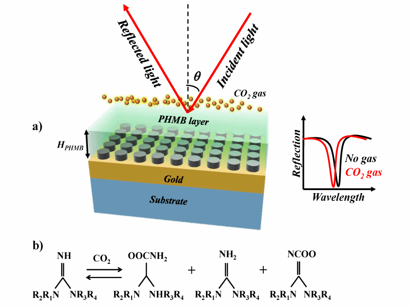 Механизм работы заключается в измерении длины волны отраженного света, который улавливается с помощью фотодетектора, а он используется для преобразования фотонов в ток. Когда газ CO2 попадает в камеру, он поглощается слоем полигексаметилен бигуанидина. После этого показатель преломления слоя уменьшается, а свет отражается под углом 45 градусов. Изменение показателя преломления слоя полигексаметилена, а также сдвиг длины волны отраженного света относительно исходного зависят от концентрации газа. Преимущество предлагаемого датчика заключается в том, что он не вызывает нежелательного изменения показателя преломления в слое полимера и не фиксирует уровень содержания других газов в воздухе — например, азота и водорода. Кроме того, можно настраивать электромагнитные характеристики материала и получать определенные оптические свойства — например, изменить уровень поглощения света и таким образом обнаружить большие концентрации углекислого газа.