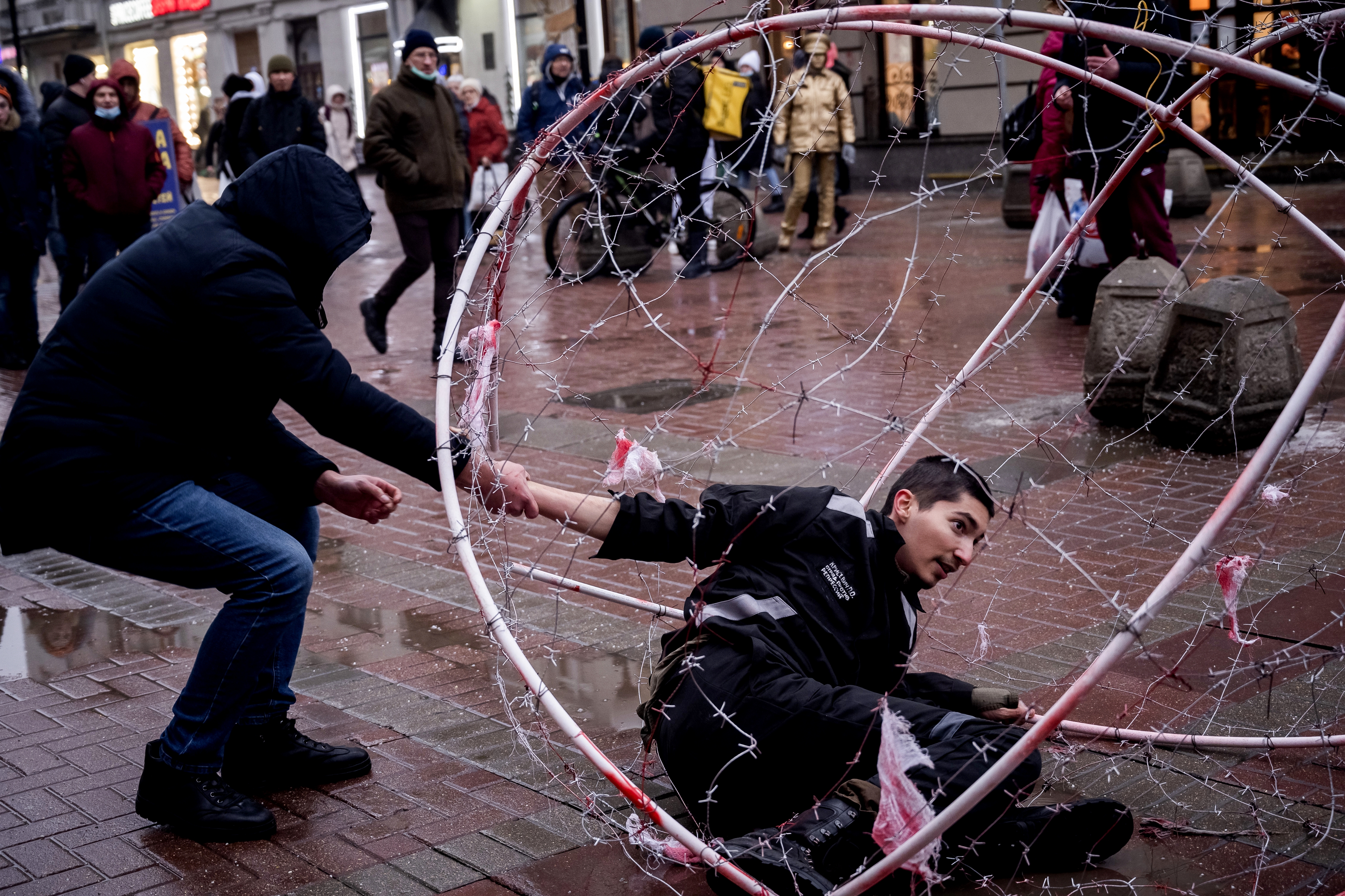 Павел Крисевич был задержан во время акции на Старом Арбате 24 января. Он забрался в сферу из колючей проволоки в робе заключённого и выкрикивал политические лозунги.
