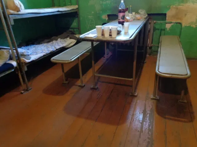 на листах стоят два ведра, одно для мусора, другое — для справления нужды. Судя по запаху, его давно никто не мыл. Стены покрашены несколько десятков лет назад. По всему периметру краска облупилась вместе со штукатуркой. Стены потертые и грязные: на них следы от пальцев, соплей, крови, непонятного происхождения органические разводы. Плевки, желтоватые разводы копоти от сигаретного дыма — люди курят прямо в камере. На побеленном потолке остались следы прошлых пожаров, черная копоть и следы от воды. Кое-где видны дыры от сверл, выцарапанные надписи с оскорблениями или черточки срока пребывания в камере или надписи «здесь был я» с датой. Пол — покрашенные деревянные доски. В целом это помещение имеет типичный ремонт СССР, если не учитывать уровень запущенности и грязи. Я просил дать мне ведро с чистящим средством и тряпку — хотел отмыть стены, но мне позволили только подмести полы веником».