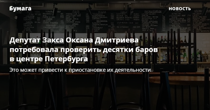 Депутат Законодательного собрания Петербурга от «Партии Роста» Оксана Дмитриева потребовала провести внеплановые проверки десятков баров Центрального района, на которые поступали жалобы. Внимание на это обратил The Village.