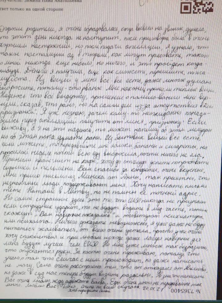 О давлении Тоня написала и в своем единственном после приговора письме – раньше письма приходили каждую неделю, но в январе было только одно, говорит Нина. Она уверена, что письма от дочери просто не доходят. По ее словам, в письме дочь скупо дала понять, что в СИЗО подвергается давлению и, возможно, избиениям. Однако прямо об этом заключенная не пишет – все письма читаются цензорами.