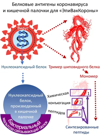 Вирус SARS-CoV-2 устроен так, что нейтрализовать его могут только антитела к шиповидному белку. Антитела к нуклеокапсидному белку этого сделать не могут: этот белок находится внутри вирусной частицы, и антитела не могут с ним провзаимодействовать [7]; следовательно, он недоступен для антител в интактном вирусе. Тем не менее нуклеокапсидный белок в качестве антигена (чужеродного вещества) может помочь иммунному ответу (см. ниже). Рис. 1 схематично показывает состав вакцины «ЭпиВакКорона».