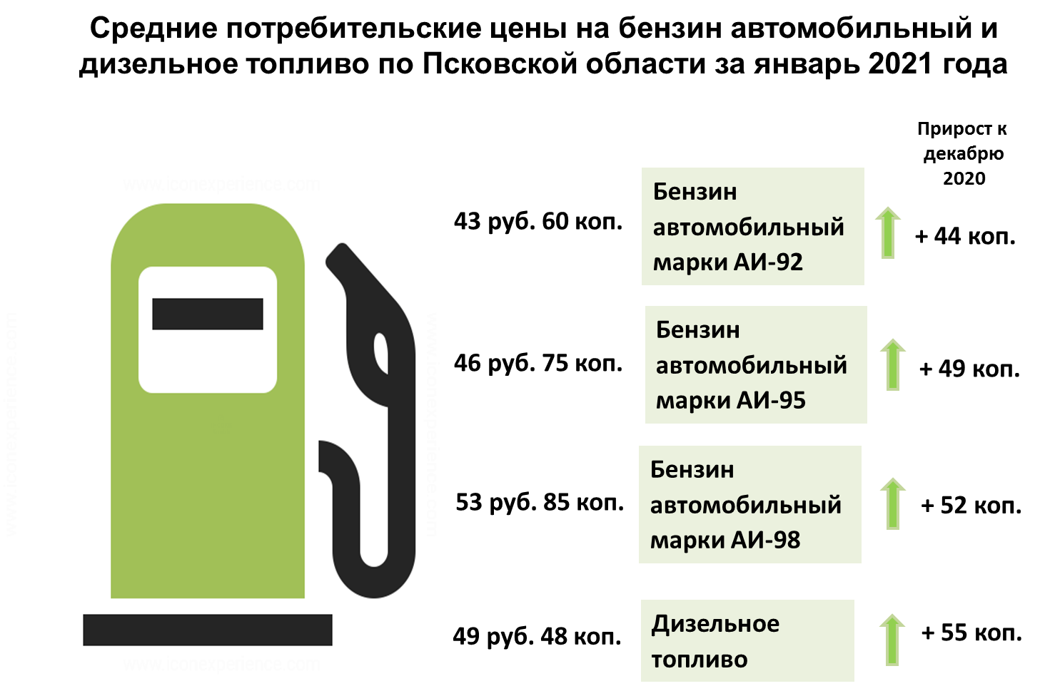 В Псковской области продолжают расти цены на топливо: по данным Псковстата, рост цен на бензин всех марок и на дизельное топливо в январе 2021 года отмечен как по отношению к декабрю 2020 года, так и по отношению к январю 2020 года.