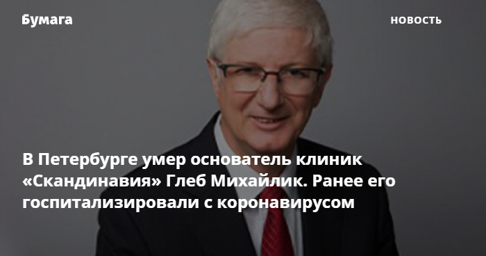 Как пишет «Доктор Питер», Михайлик умер в Боткинской больнице, куда поступил около месяца назад с коронавирусом.