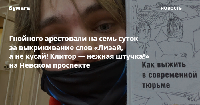 Как рассказывает Ясман, Гнойного арестовали по статье о мелком хулиганстве (20.1 КоАП РФ) за выкрикивание слов «Лизай, а не кусай! Клитор — нежная штучка!»