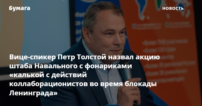 Заместитель председателя Госдумы Петр Толстой, член «Единой России», сравнил будущую акцию штаба Навального с фонариками с действиями «перебежчиков-коллаборационистов во время блокады Ленинграда». Об этом пишет «Фонтанка» со ссылкой на трансляцию заседания в думе.