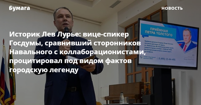 Историк Лев Лурье прокомментировал заявление зампреда Госдумы Петра Толстого, который сравнил будущую акцию штаба Навального с фонариками с действиями «перебежчиков-коллаборационистов во время блокады Ленинграда, когда они фонариками подсвечивали цели немецкой авиации».