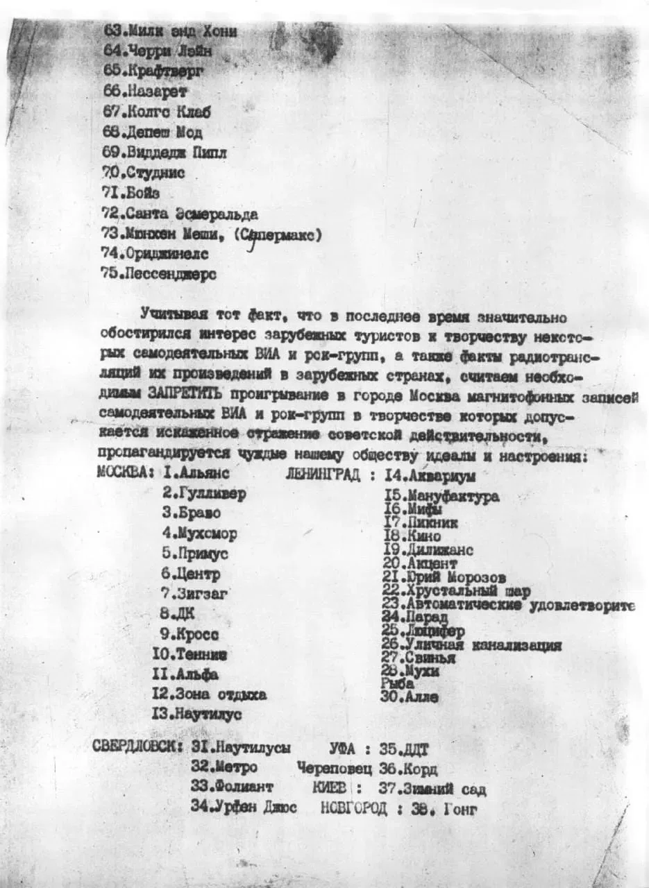Партийные и карательные органы отнеслись к спискам очень серьезно, как к руководству к действию. Другой вопрос, к чему это привело. Ни к чему по большому счету, а в итоге дало обратный эффект. «Аквариум», по воспоминаниям Гребенщикова, сыграл в то время рекордное количество подпольных концертов. Шевчук переехал в Москву и записал с московскими музыкантами гениальный альбом «Время», который не мог бы появиться в Уфе. Агузарова через несколько месяцев вернулась, и все продолжилось. Группы меняли названия, конспирировали, уходили в подполье, но продолжали играть и записываться.