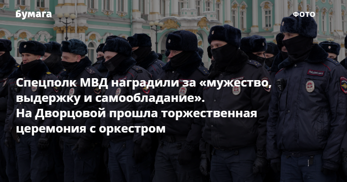 Днем 12 февраля на Дворцовой площади прошла церемония награждения специального полка ГУ МВД. Об этом сообщили в пресс-службе петербургского Закса.