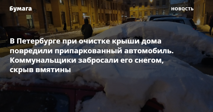 В Центральном районе Петербурга при очистке крыши дома от глыб льда был поврежден минимум один из припаркованных рядом автомобилей. После этого сотрудники коммунальных служб забросали машину снегом, скрыв вмятины. Об этом рассказали местные жители в группе «ДТП и ЧП», приложив к посту фотографии и видео.