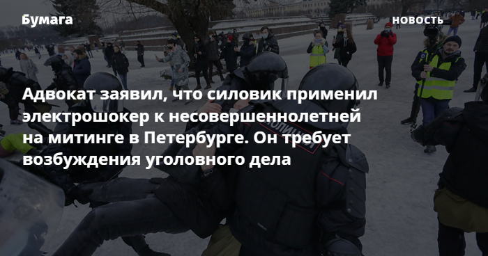 Адвокат «Правозащиты Открытки» Павел Ясман подал в Следственный комитет по Петербургу заявление с требованием возбудить уголовное дело из-за того, что силовик ударил электрошоком несовершеннолетнюю девушку. Информацию об этом Ясман подтвердил «Бумаге».