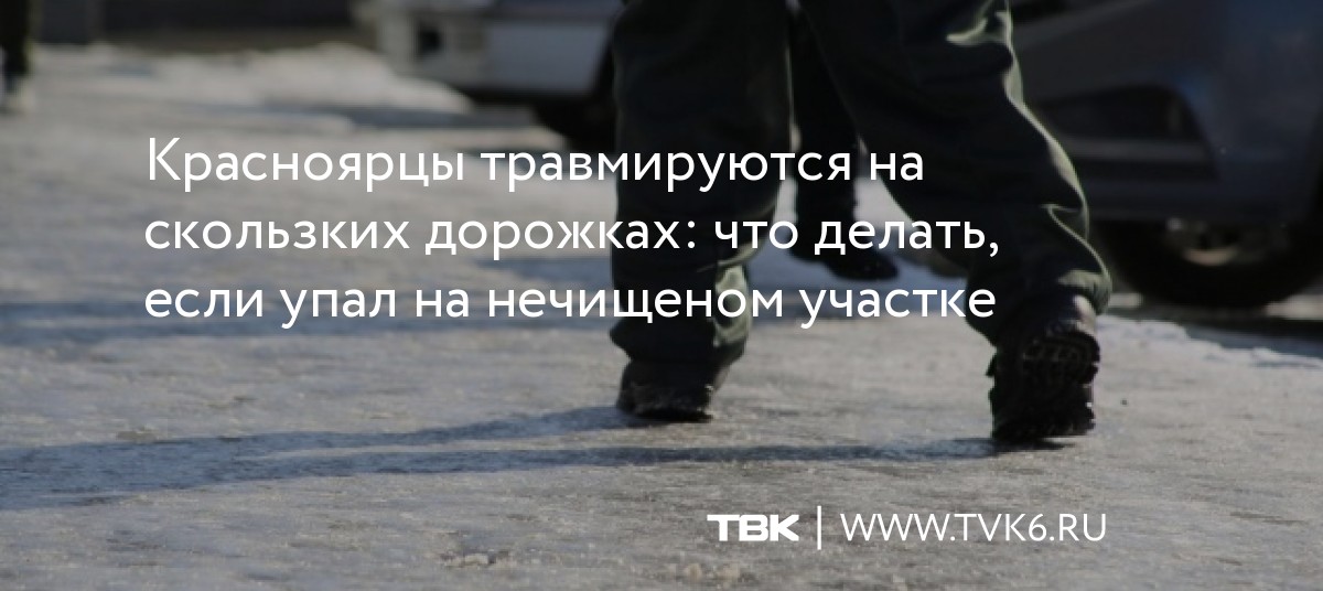 Территория Красной площади находится под ответственностью Красгорпарка. Как «ТВК Красноярск» пояснили в пресс-службе организации, если кто-то упал на скользкой дорожке и получил травмы, необходимо, как и получилось в случае красноярки, на месте вызвать "скорую", чтобы зафиксировать травмы, место и причину падения. После нужно направить претензию тому, кто отвечает за территорию.«Люди подбежали, помогли, вызвали "скорую". В травмпункте мне загипсовали ногу, поправили вывих, и с переломом отправили в БСМП. Там сказали, что надо вставать на учет и ждать, когда придут металлоконструкции, и ложиться на операции. Сейчас дома, по квартире передвигаюсь со стулом, ищем костыли.
