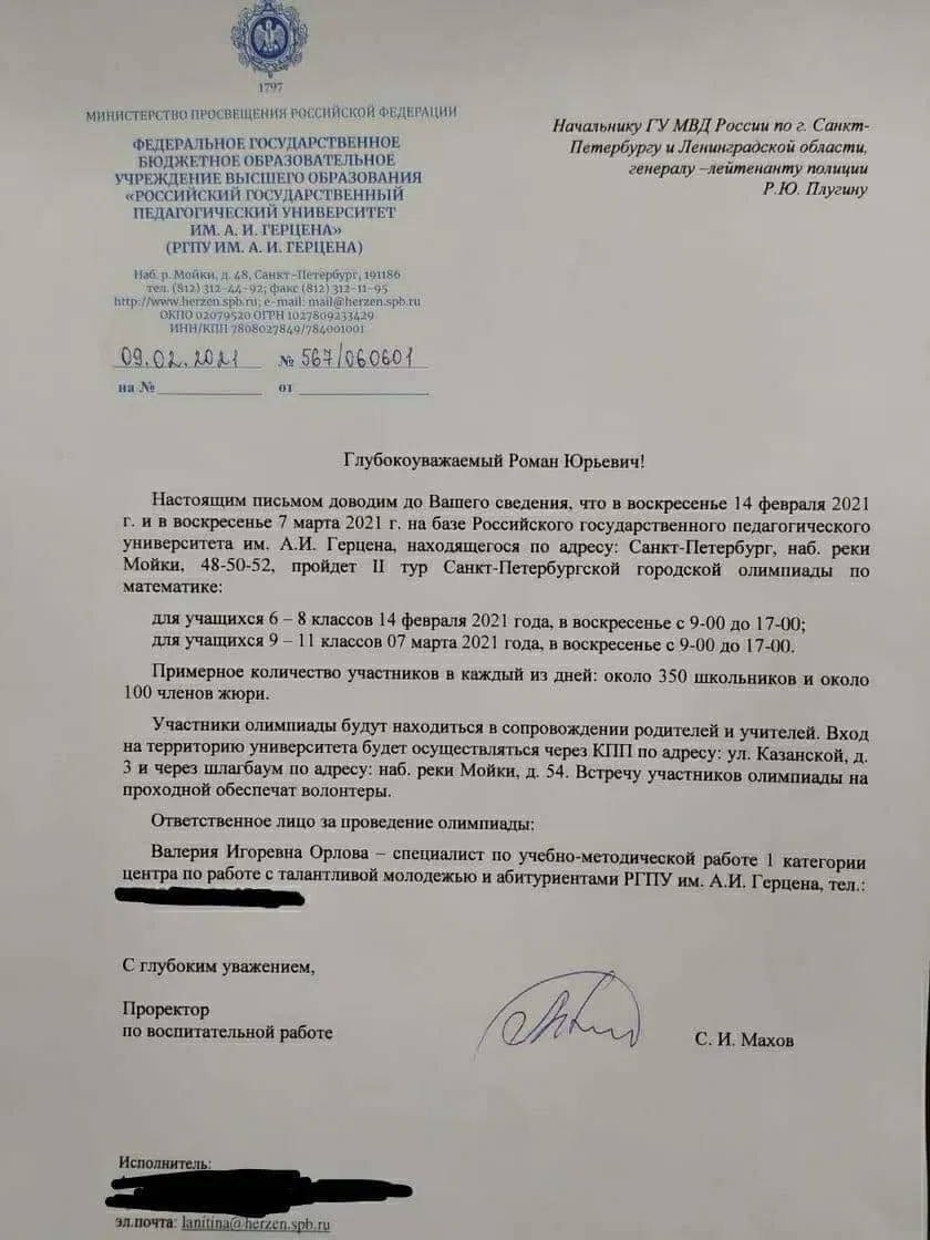 Масштаб этой подготовки можно оценить по ситуации, в которой оказался Российский педагогический университет имени Герцена (РГПУ). Беда вуза в том, что находится он не просто в центре Петербурга, а на набережной Мойки, рядом с Невским проспектом. И как раз 14 февраля там проходит этап олимпиады по математике для школьников: 350 детей (с 6-го по 8-й классы) вынуждены будут к 9 утра пробираться к зданию на Мойке, а после 17 часов захотят вернуться домой. Чтобы юные математики оказались на олимпиаде, а не в автозаке, им раздали по экземпляру письма, подтверждающего цель прохода по Невскому, от проректора РГПУ на имя начальника ГУ МВД по Санкт-Петербургу и Ленобласти. «С разъяснением, что это можно предъявить в случае чего», — написал в фейсбуке депутат петербургского парламента Борис Вишневский, публикуя скан письма.