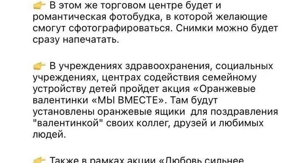 Кроме этого, 14 февраля, по данным из тех же источников, «волонтеры будут массово вручать прохожим цветы». В социальных учреждениях, больницах и поликлиниках, центрах содействия семейному устройству детей пройдет акция «Оранжевые валентинки «МЫ ВМЕСТЕ» (в оранжевый ящик можно опустить валентинку для коллег, друзей и любимых). А в одном из торговых центров города появится фотобудка и арт-объект в форме сердца, который станет, по задумке организаторов, «оффлайн-тиндером» — на нем можно написать свои контакты для знакомства.