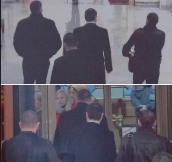 Поскольку на кадрах видеонаблюдения в материалах уголовного дела все четверо сняты входящими в гостиницу, можно с уверенностью опознать их по спинам, когда они вместе покидают отель. На верхнем кадре слева направо Геремеев, Дмитерко и Алиев, сзади них — Эскерханов. На нижнем кадре Геремеев первым подходит к двери, за ним слева направо — Эскерханов, Дмитерко и Алиев.