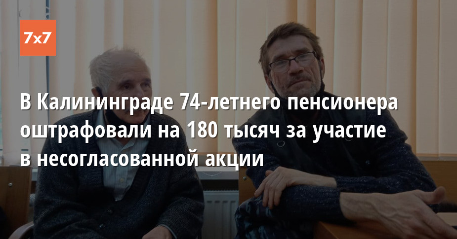 В Калининграде суд оштрафовал 74-летнего пенсионера Петра Зуева на 180 тыс. руб. за участие в несогласованной акции 31 января. Ранее на него уже дважды возбуждали административные дела — за участие в акции «Он нам не царь» 5 мая 2018 года и за пикет в поддержку калининградского врача, обвиняемого в убийстве младенца. Решение принял Ленинградский районный суд 15 февраля. Об этом корреспонденту «7x7» рассказал сам Зуев.