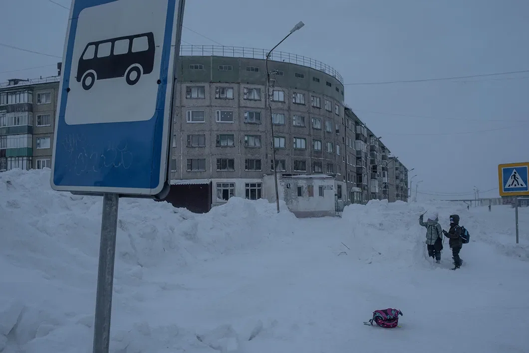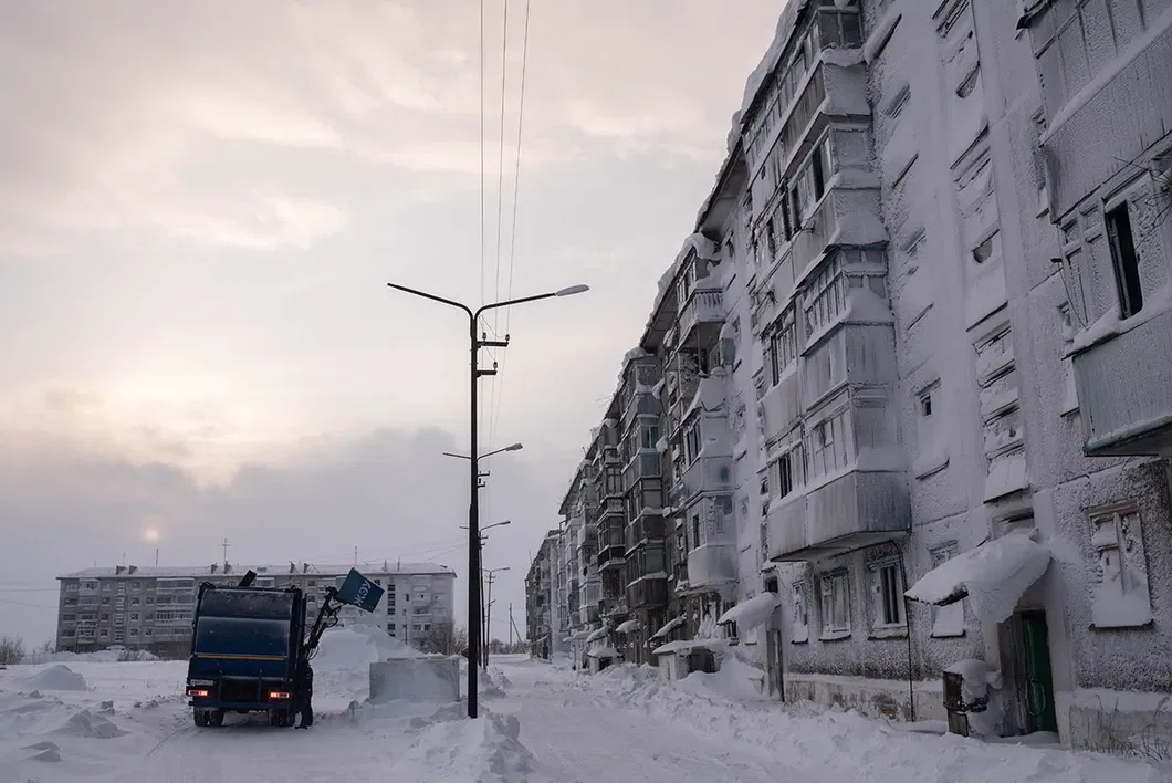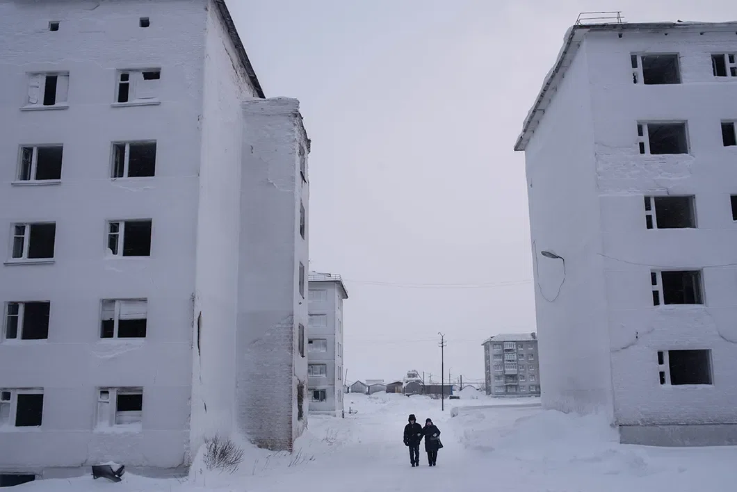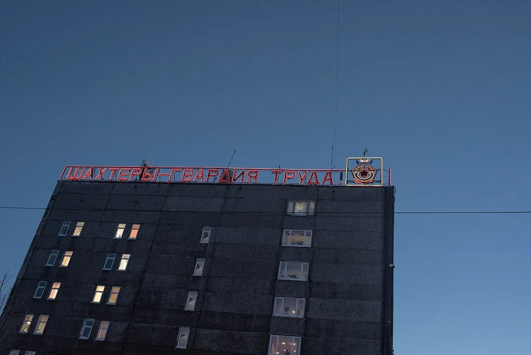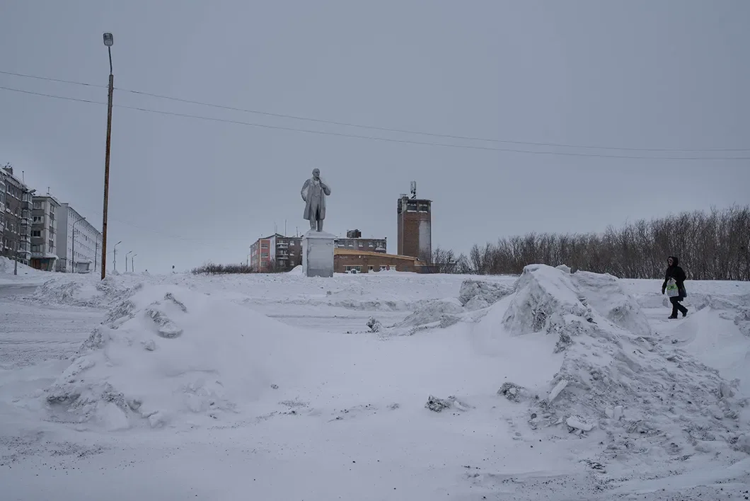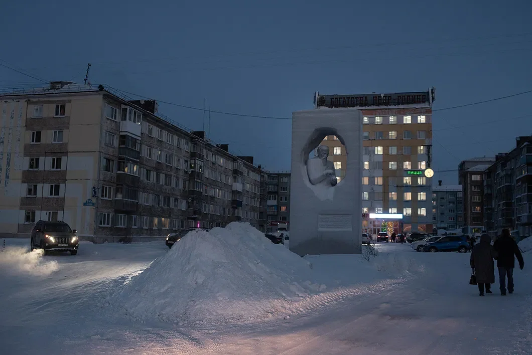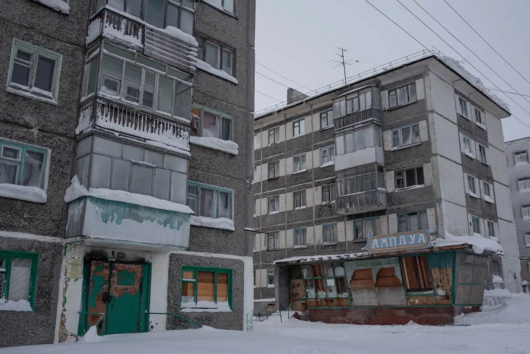 Поселок Комсомольский, 22 км от Воркуты. Дороги посыпаны штыбом — измельченными кусочками угля, чтобы машины и прохожие не скользили. Серые сугробы сливаются с домами. Чернеют квадратики-окна.