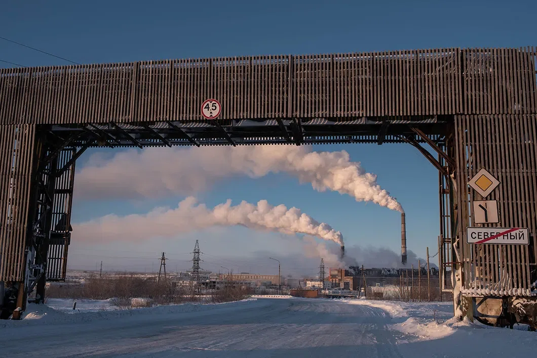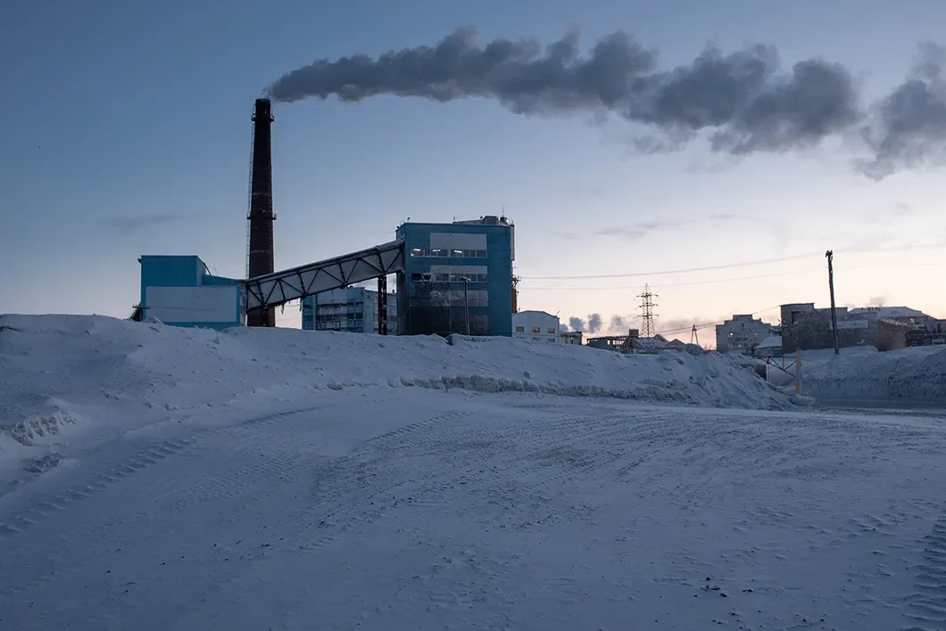 Угольная шахта «Воркутинская». Снег вокруг — серый, в «штыбе» — производном продукте от добычи каменного угля. Фото: Виктория Одиссонова / «Новая газета»