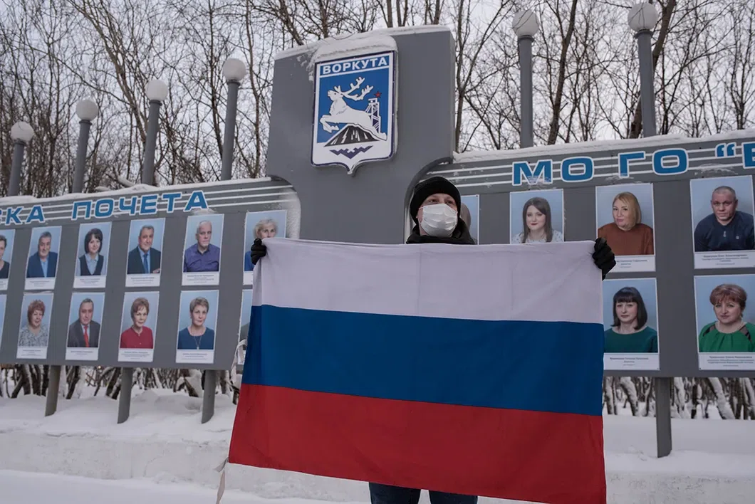 Один из протестующих у здания администрации Воркуты. Фото: Виктория Одиссонова / «Новая газета»