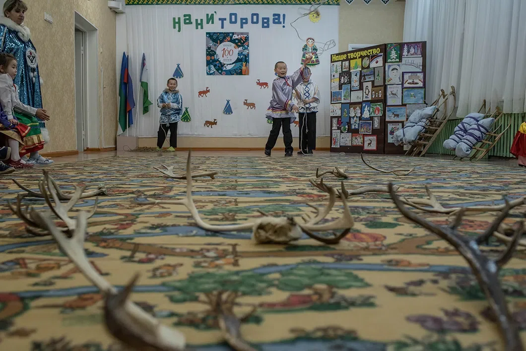 Вечером мы приезжаем в школу-интернат для детей тундры. Там живут и учатся дошкольники и ученики начальных классов. С детства они умеют обращаться с оленями и знают все о кочевой жизни. Но родители берегут их от суровой зимы до тех пор, пока они не подрастут. Забирают в тундру только на лето.