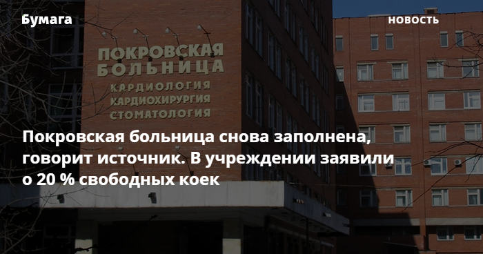 В пресс-службе Покровской больницы сказали «Бумаге», что в учреждении свободно 20 % коечного фонда. При этом в больнице отрицают, что пациентов размещают в коридорах. Источник объяснил это тем, что днем 16 февраля планировалась выписка большого количества пациентов.