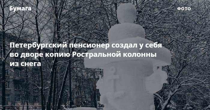 Петербургский пенсионер Владимир Кузьмин, который с 2010 года лепит снежные скульптуры у себя во дворе у «Черной речки», создал новую работу — копию Ростральной колонны в миниатюре.