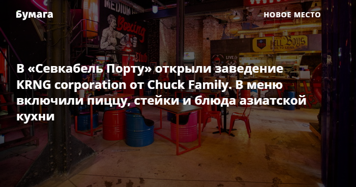 На территории пространства «Севкабель Порт» открыли заведение KRNG corporation от Chuck Family (митерия Chuck и другие проекты), рассказали «Бумаге» представители команды.