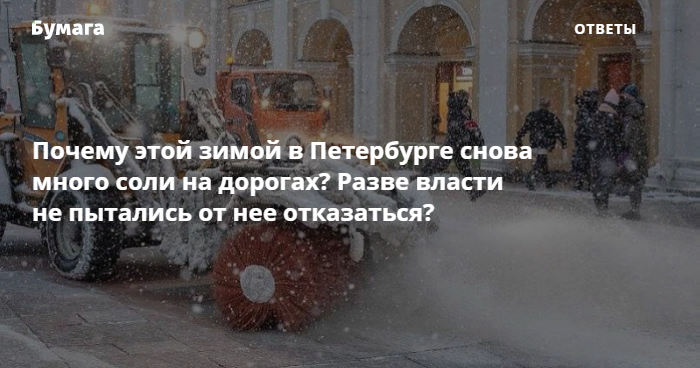 С 2011 года власти Петербурга постоянно сокращали использование соли на фоне многочисленных жалоб горожан на порчу обуви и одежды. К 2016-му ее почти не было на дорогах. Зимой 2019/2020 Смольный вернулся к массовому применению соли. В тот год ее заготовили столько же, сколько сейчас — 100 тысяч тонн. Однако запасы используют не полностью. Зимой 2019/2020 в Петербурге применили только 15 тысяч тонн соли, этой зимой чиновники рассчитывают потратить половину запасов. В комитете по благоустройству говорят, что вопрос о полном отказе от противогололедных материалов никогда не стоял. По возможности их применение минимизируют, но не в ущерб безопасности горожан, пояснили «Бумаге» в пресс-службе. «Фонтанка» и «Деловой Петербург» отмечают, что одним из главных противников соли в Смольном был бывший глава комитета по благоустройству Владимир Рублевский. Последней при нем была зима 2018/2019, когда в городе произошел снежный коллапс: улицы не успевали убирать, горожане жаловались на скользкие дороги и тротуары, многие получали травмы. Рублевский ушел с должности в октябре 2019 года — как раз накануне следующего зимнего сезона. В итоге той зимой город заготовил в пять раз больше соли, чем годом ранее. Новый руководитель комитета Сергей Малинин разрешал использовать чистую техническую соль в местах, где успел сформироваться сильный гололед. Только меня бесит соль на дорогах?