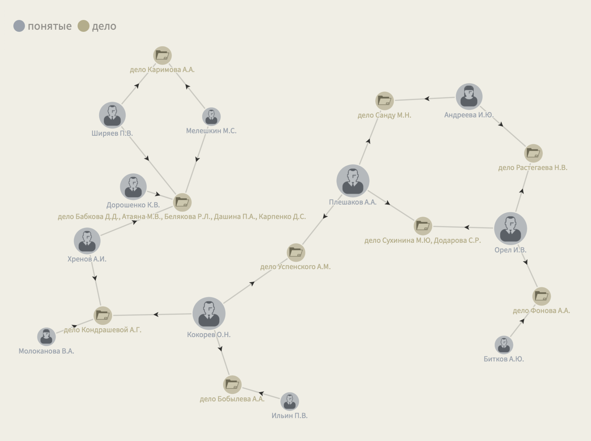 В тех случаях, где имена сохранились, мы с помощью специально написанной программы извлекли их из текстов и выбрали имена и фамилии, которые встречаются в документах по разным делам. Открытые списки судей, секретарей, адвокатов, прокуроров и их помощников помогли нам сразу исключить их из выборки. Остальные имена журналисты «Важных историй» и «Медузы» в течение трех месяцев изучали вручную: читали документы, выписывали даты, районы, обстоятельства, суды, отделы полиции и их сотрудников, следователей, прокуроров, адвокатов и судей. А после искали этих понятых и изучали их связи с сотрудниками полиции.