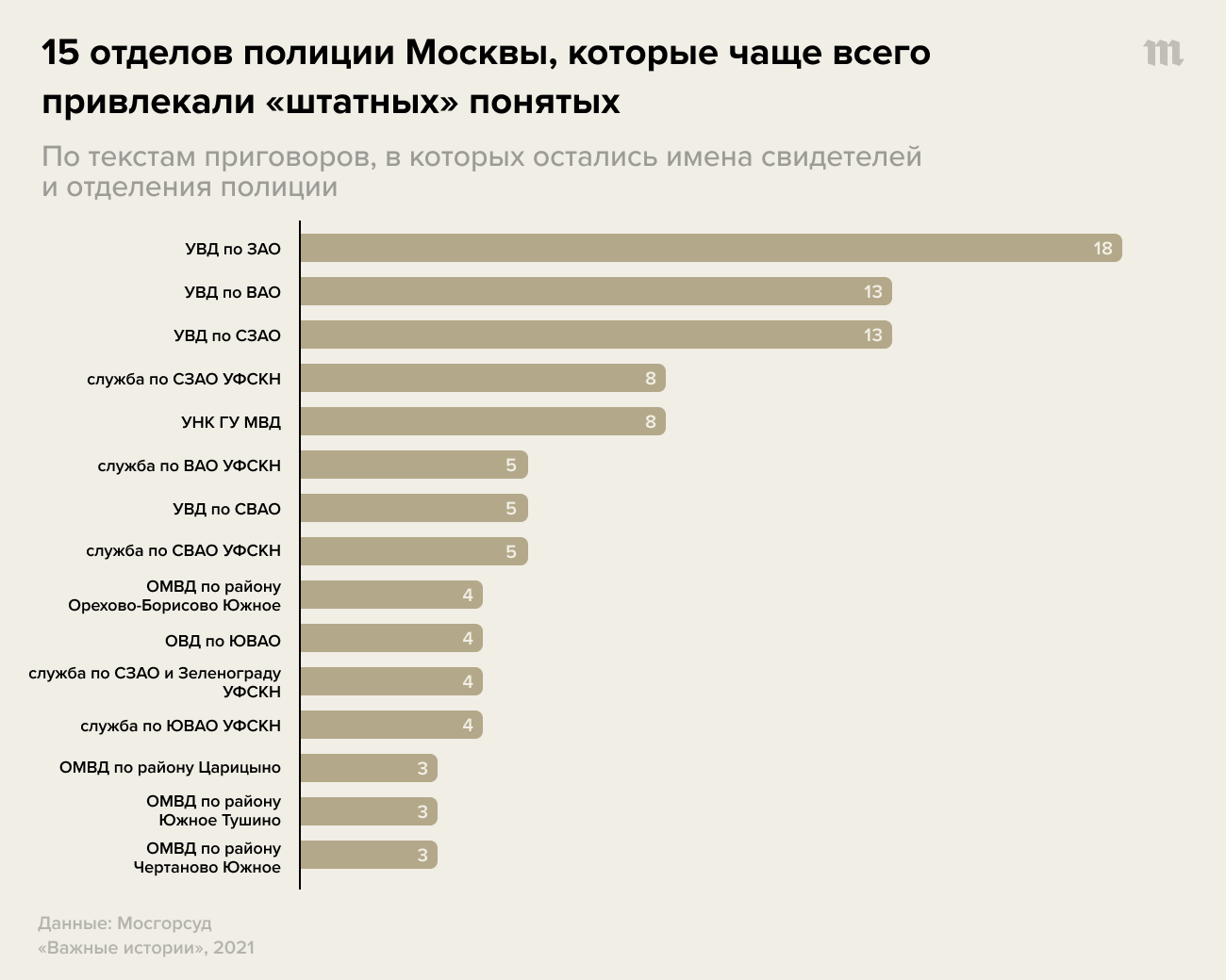 Журналисты «Важных историй» и «Медузы» исследовали документы московских судов и нашли в них более 140 «штатных» понятых, которые регулярно свидетельствовали в судах по наркотическим статьям. Это не проходившие мимо граждане, а знакомые полицейских или те, кто находится от них в зависимости. Несмотря на грубое нарушение закона при привлечении таких понятых, судьи с их помощью отправляют людей за решетку.