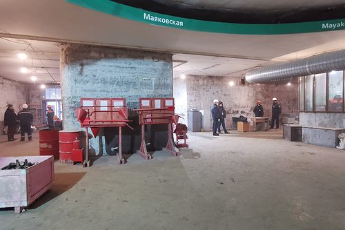 Уже демонтированы мраморная облицовка стен и таблички со словами Владимира Маяковского на пилоне вестибюля, рабочие снимают гранитные напольные покрытия и подвесной потолок. Полностью демонтированы электрические сети, системы вентиляции и пожаротушения.