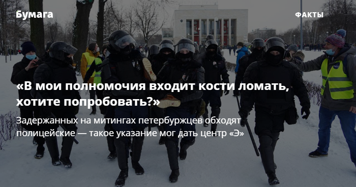 «Бумага» подводила итоги январских митингов в Петербурге: недовольных всё больше, силовики и протестующие всё агрессивнее, а власть не идет на диалог. Читайте также интервью с пострадавшей на первой акции Маргаритой Юдиной — об ударившем ее силовике, проблемах со здоровьем и давлении властей после жалобы в СК.