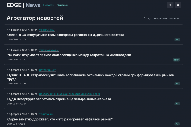 За хакатон Александр Зоркин создал платформу «EDGE News», которая представляет собой агрегатор последних новостных сводок и текстовых онлайн-трансляций с самых популярных новостных ресурсов в единую ленту.