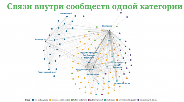 Команда работала над исследованием о городском активизме и попробовала понять, как подсчитать масштабы и степень его развития. За хакатон команде удалось сделать тематическую карту сообществ, показывающую все разнообразие и классификацию активистских движений Санкт-Петербурга, а также визуализировать связи между группами через взаимное участие онлайн-активистов сообществ Петербурга.