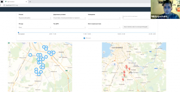 Команда работала над интерактивной картой, где пользователь может ознакомиться со всеми случаями ДТП в своем регионе с учетом заданных фильтров, выявить места концентрации аварий, проанализировать их причины, а также ознакомиться с дорожной ситуацией в интересующем его месте.