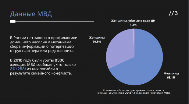 По их данным, 61 процент от общего числа убитых женщин в 2018 году были убиты партнерами или родственниками. По данным Росстата, за 2018 год всего было убито 8300 женщин. Минимум 5000 из них убиты в ситуации домашнего насилия. При этом МВД сообщало только о 253 таких случаях за 2018 год.