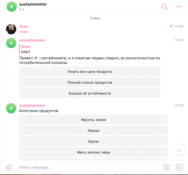 При выборе категории продукта бот выдает значение «устойчивой цены», на основе которой можно определять, насколько «дорого» обходится тот или иной продукт существующим экосистемам. Таким образом, продукты можно сравнивать друг с другом, как и при использовании привычной цены.