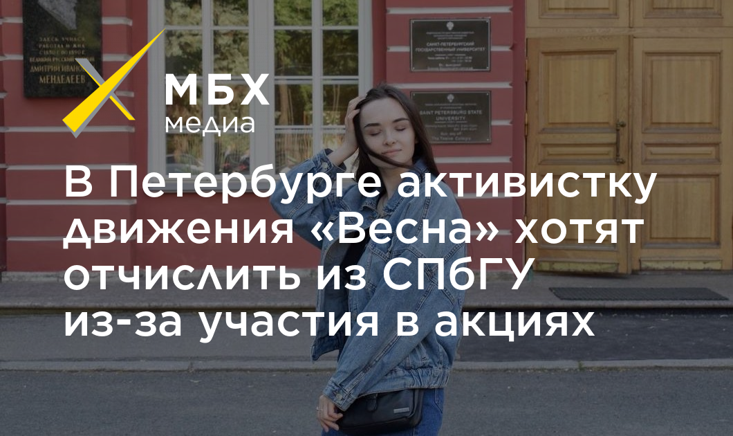 В Петербурге студентку вечернего отделения факультета журналистики СПбГУ и активистку движения «Весна» Елену Скворцову пытаются отчислить из вуза из-за участия в акциях, об этом она сообщила «Северо-Запад. МБХ медиа». По словам Скворцовой, формальным поводом для отчисления стал отказ засчитать результаты производственной практики.