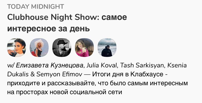 Что это: комнат и обсуждений в Clubhouse стало настолько много, что успеть на все невозможно. Поэтому самые активные участники сервиса придумали вечернее шоу, в котором они делятся своими наблюдениями о произошедшем в сервисе за день и спрашивают у слушателей, что интересного они узнали. Комната проходит каждый день в 00:00.
