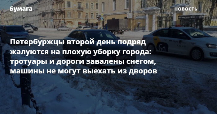 Жители Адмиралтейского района рассказывают, что не могут даже подобраться к машинам. Схожая ситуация в Девяткине. Жители ЖК «Две столицы» в Московском районе обратились к своей управляющей компании, написав на снегу многометровыми буквами: «Пора убрать снег!» В центре горожане также жалуются, что снег с крыш домов сбрасывают прямо на проезжую часть.