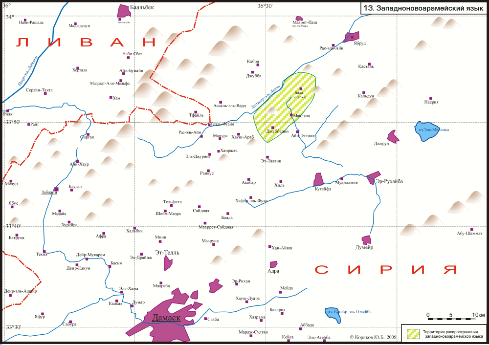 Когда же мы перемещаемся в последнюю треть XIX века, то во всем Леванте обнаруживаем лишь три живых западных арамейских говора, — последние остатки западного диалектного континуума, который, судя по кумулятивным данным, в VII веке н. э. шел от широты Алеппо до Газы (то есть до юга Палестины). Это диалекты трех смежных деревень в горах Каламуна (северо-восточная часть хребта Антиливан), в часе езды на машине к северо-востоку от Дамаска. В обозримый период времени (до начала нынешней гражданской войны в Сирии) одна из этих деревень, Маалула1 (Maʕlūla) была населена преимущественно христианами двух конфессий — прихожанами Антиохийского патриархата и мелкитами (католиками византийского обряда). В двух других — Баха (Baxʕa) и Джуббадин (Ǧubbʕadīn, арамейское название — Ġuppaʕōḏ) жили мусульмане-сунниты.