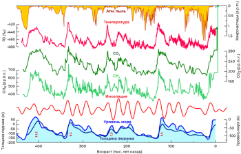 Изучение ледяных кернов позволило установить общие закономерности естественных изменений климата планеты за последние 0,8 млн лет. В первом приближении изменения температуры были квазипериодическими и асимметричными. Приблизительно каждые 100 тыс. лет имели место короткие теплые межледниковья, сменявшиеся длинными холодными ледниковыми периодами, причем переход от теплых эпох к холодным был постепенным, а переход от холодных эпох к теплым — резким и интенсивным. Голоцен — современное межледниковье, в котором мы живем, — начался 11 700 лет назад. Интересно, что самый теплый этап голоцена, его термический оптимум, мы прошли 6–8 тыс. лет назад и с тех пор медленно двигались к следующему ледниковому периоду, но современное антропогенное потепление повернуло этот процесс вспять.