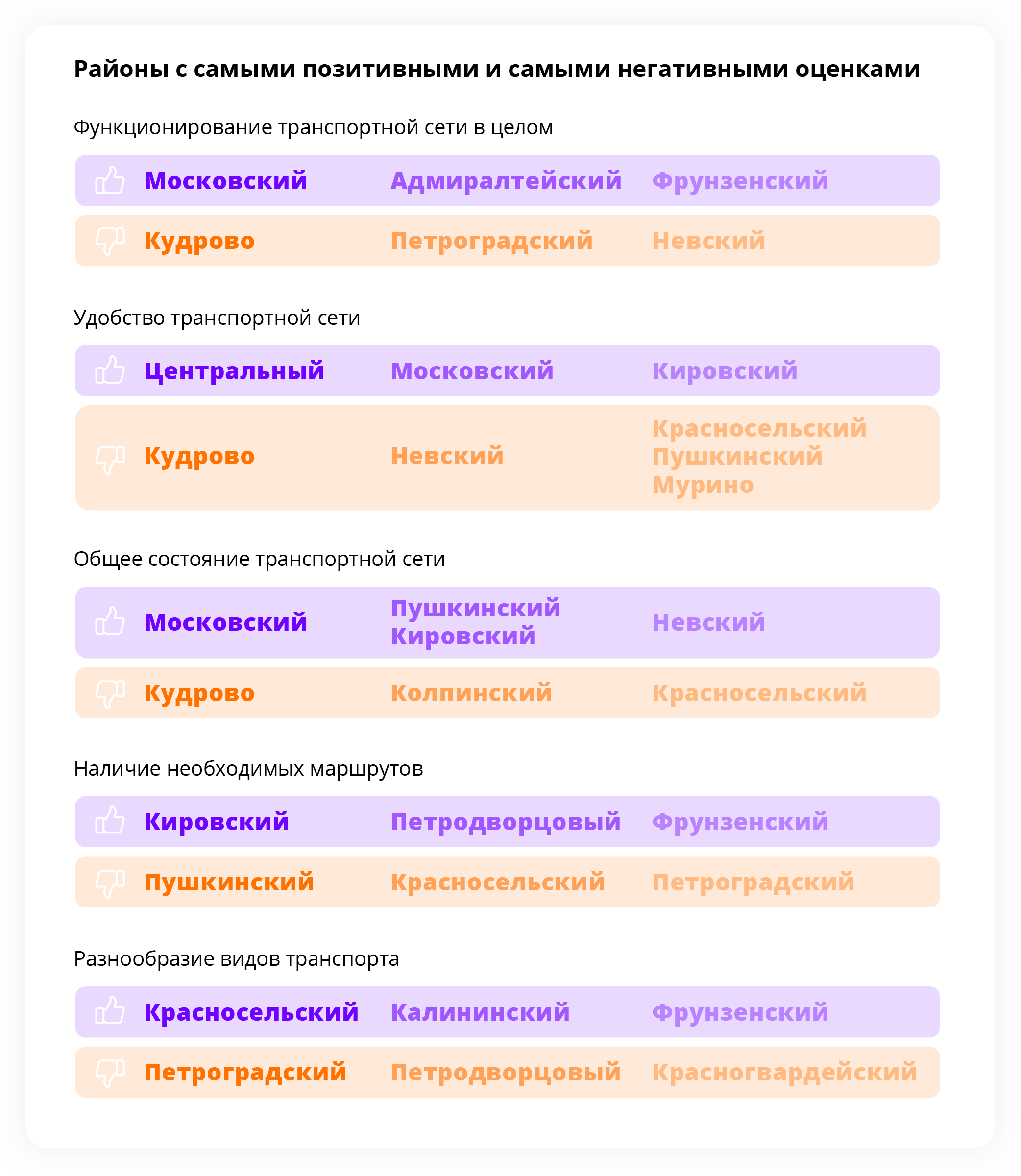 Гипотеза подтвердилась лишь частично. Некоторые районы, расположенные достаточно далеко от центра, петербуржцы оценили высоко: например, Красносельский, Кировский, Пушкинский, Петродворцовый. И всё же район Кудрово оценили ниже всего: местные жители недовольны общим функционированием транспортной системы, удобством и состоянием транспортной сети.