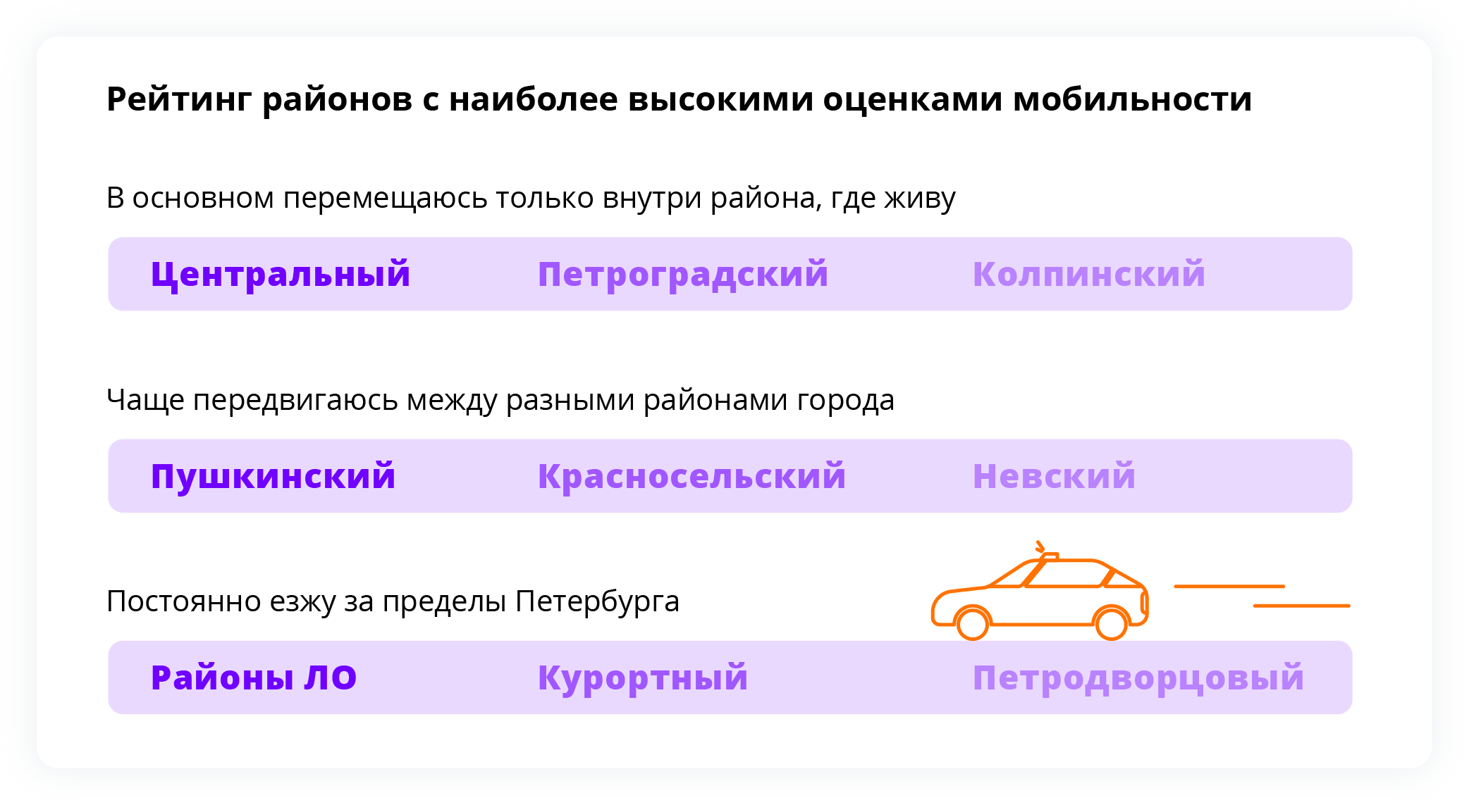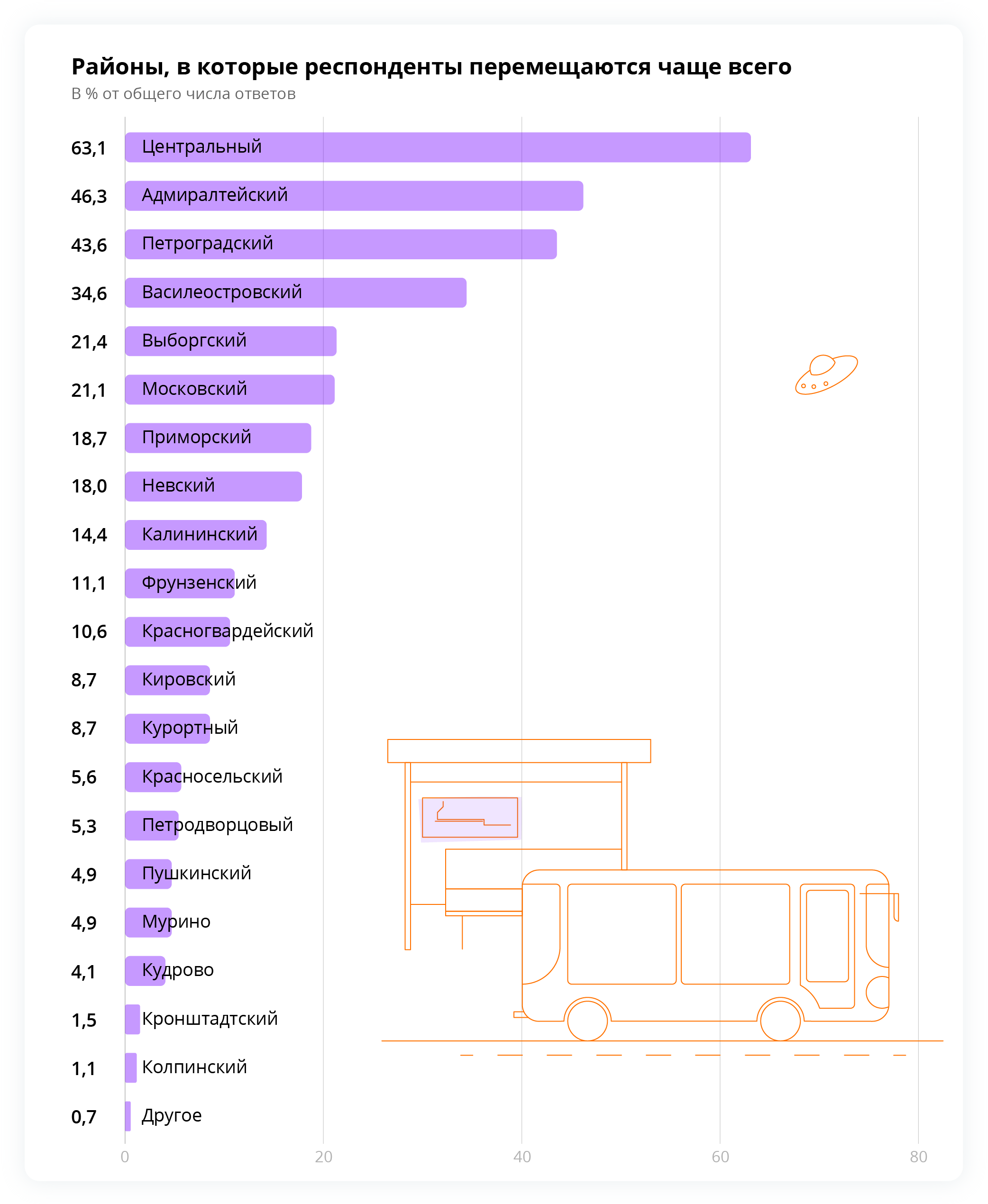 В начале опроса отдел исследований «Бумаги» попросил участников оценить собственную мобильность. 65 % респондентов рассказали, что в основном передвигаются между разными районами Петербурга, 24 % отметили, что чаще перемещаются внутри своего района, 10 % постоянно ездят за пределы города. При этом мобильность передвижений между районами у людей в возрасте 40–50 и старше ниже, чем у остальных.